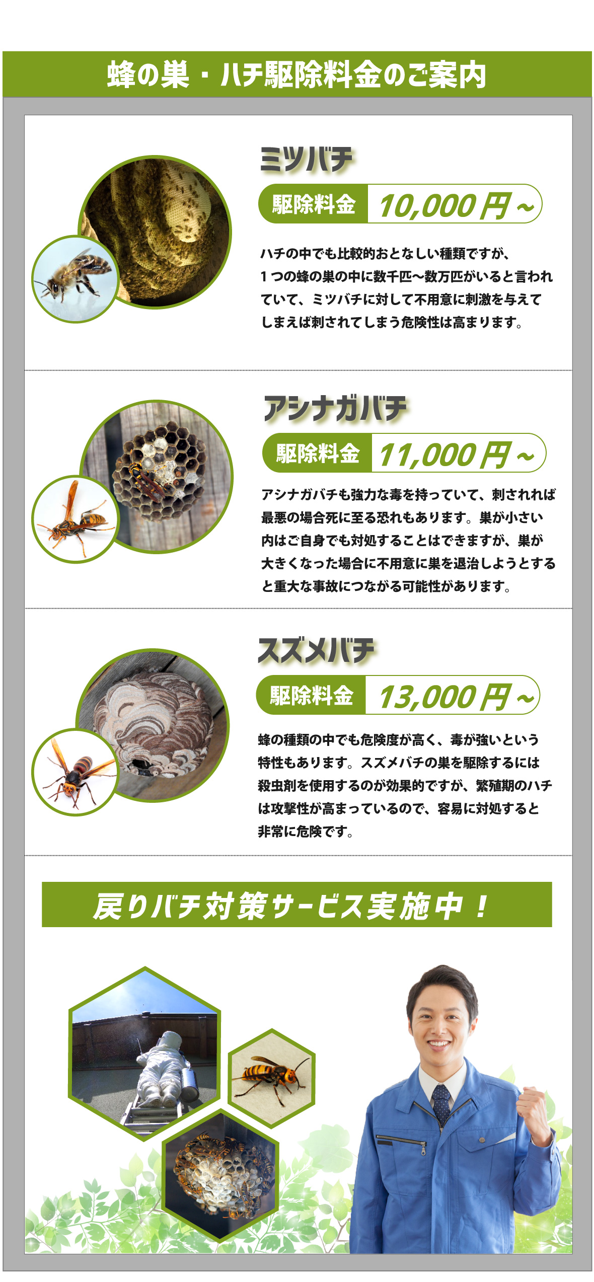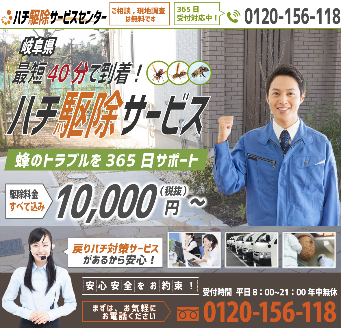電話をかける(click)本巣市で軒先・軒下、ベランダや庭、自宅玄関などに蜂の巣がある、蜂の巣は見当たらないが蜂が家の周りや部屋の中でよく見かけるといった際は、すみやかに蜂の巣駆除(ハチ駆除・退治・除去)を業者に依頼することをおすすめいたします。しかし、蜂の巣駆除といっても馴染みのないサービスで、どういったハチ駆除業者に依頼すればよいかお悩みの方もみえるのではないでしょうか?出来るならば、実績のある人気の蜂の巣業者、口コミや評判がよい安心安全のハチ駆除会社、多くのおすすめを受けているハチ業者に依頼したいものです。そこで安心してハチ駆除を完了させるために信頼出来る優良業者の見つけ方をご紹介します。業者選びの際、比較しやすいのが料金・価格・費用かと思います。ハチ駆除の料金は、ハチの種類・巣の大きさ・巣の場所・巣の高さなど状態によって異なります。そこで利用したいのが『無料現地調査・無料見積もり』です。無料ならば気軽に依頼しやすく、的確に現地調査をしてもらった上で、見積もりの内訳までわかりやすく丁寧に説明してくれる蜂の巣業者であれば安心ですね。同様に気になるのが『対応の早さ』です。近くに蜂の巣がある、ハチが飛んでいると、いつハチ被害が出てしまわないか心配ですよね。また、蜂の巣は屋根裏や床下、天井や窓際などわかりにくい箇所に巣を作ることもあります。そこで問い合わせをしてから、スムーズ・スピーディーに即日で駆けつけて対応してくれる業者をおすすめいたします。業者によっては即日対応・即日解決の退治・除去も可能となっているので事前に確認しておきましょう。また、業者の『実績』も確認しておきたいポイントです。実はハチ駆除に必要な資格というものはありません。そのため業者の技術・知識力が不十分だと、戻りバチなどのハチ被害の再発や駆除によって家を傷つけてしまうといった問題が発生する恐れがあります。実績豊富な業者であれば、多くのケースに精通し、これまでの経験とノウハウをもとに安心・安全・確実に駆除を行えます。業者選びにあたり、このようなポイントがありますが、とりあえずハチ被害やハチ駆除について質問や相談だけしてみたいといった方も多くみえるのではないでしょうか。当社では年中無休365日・通話料無料の相談窓口を設けております。窓口では研修を受けた自社社員がハチ被害やサービスについてお客様がご安心出来るまで丁寧に対応いたします。また、現地調査・見積もりも無料で承っております。駆除料金(見積り価格・作業費用・ご請求金額)に関しましても、業界の相場、適正料金でご対応しております。ミツバチは10,000円から、アシナガバチは11,000円から、スズメバチは13,000円から駆除対応しております。現地調査の際は、経験豊富なプロのスタッフが直ちに駆けつけます。また、実際の作業では専用の薬剤を使用した駆除技術で戻りバチ対策の再発防止もしっかりと行います。蜂の巣被害やハチに刺されてケガをしてしまっては大変です。蜂の巣駆除・ハチ被害でお悩みの際は、ちょっとした質問からでもお気軽にお問い合わせください。
